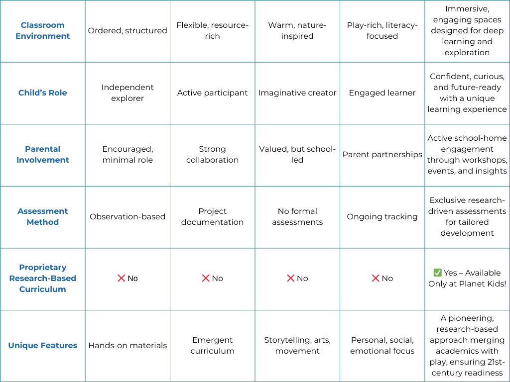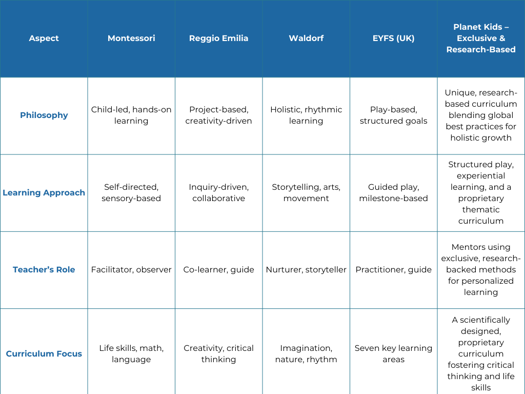 At Planet Kids, we follow a balanced child-centered and teacher-guided approach, ensuring a strong foundation for lifelong learning. Inspired by global best practices, our methodology combines guided learning with focused instruction, helping children grasp concepts effectively and at their own pace.